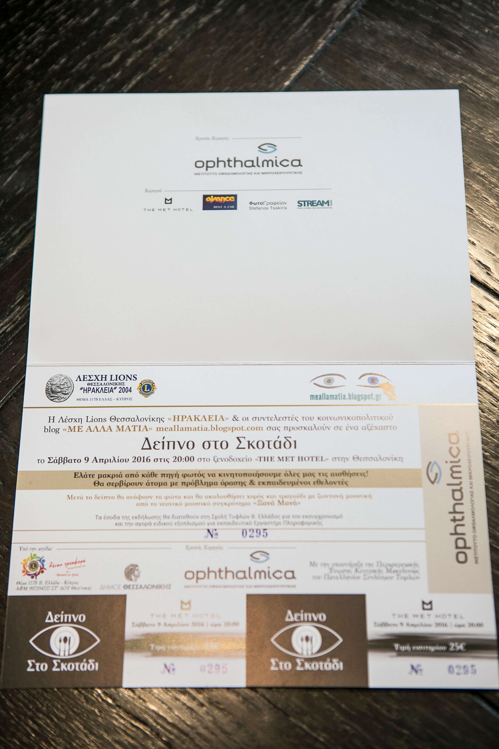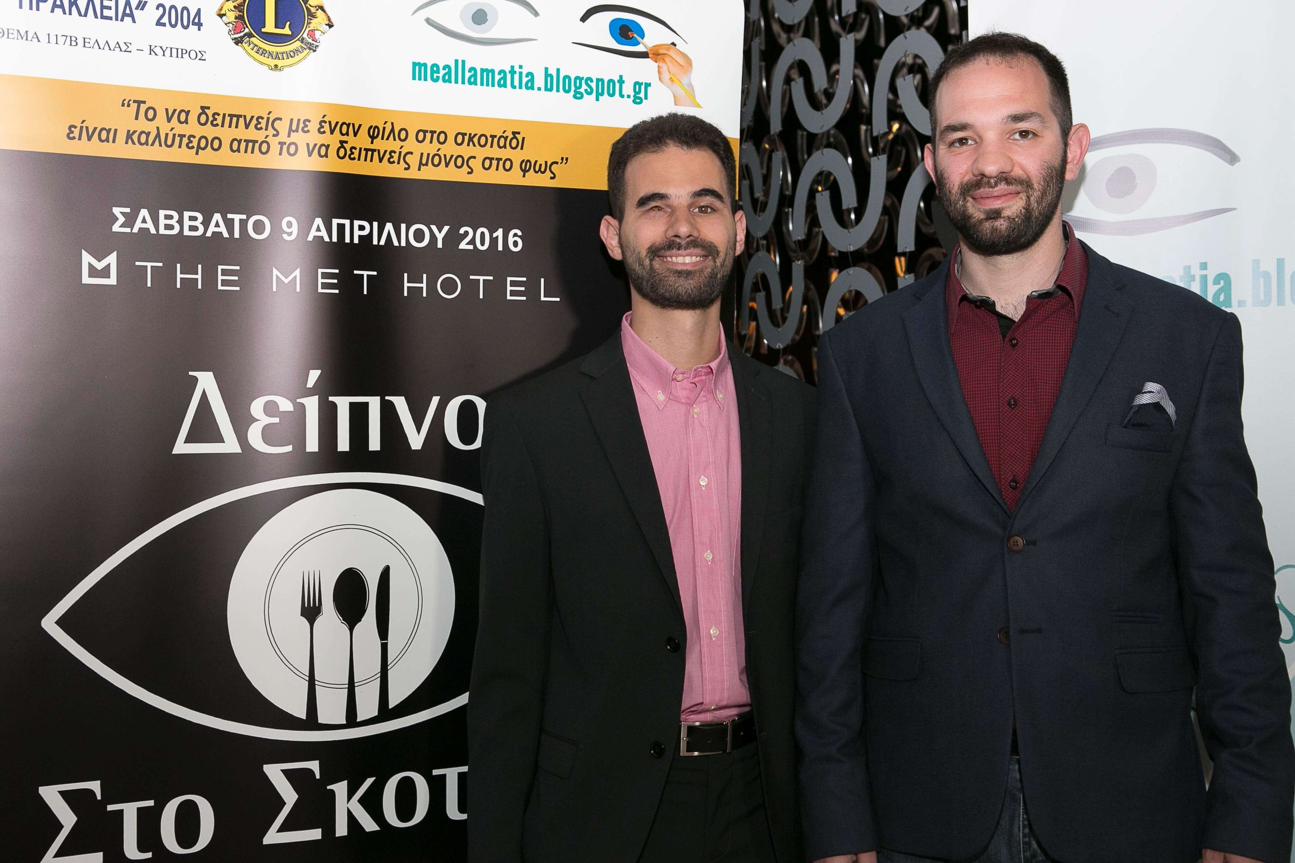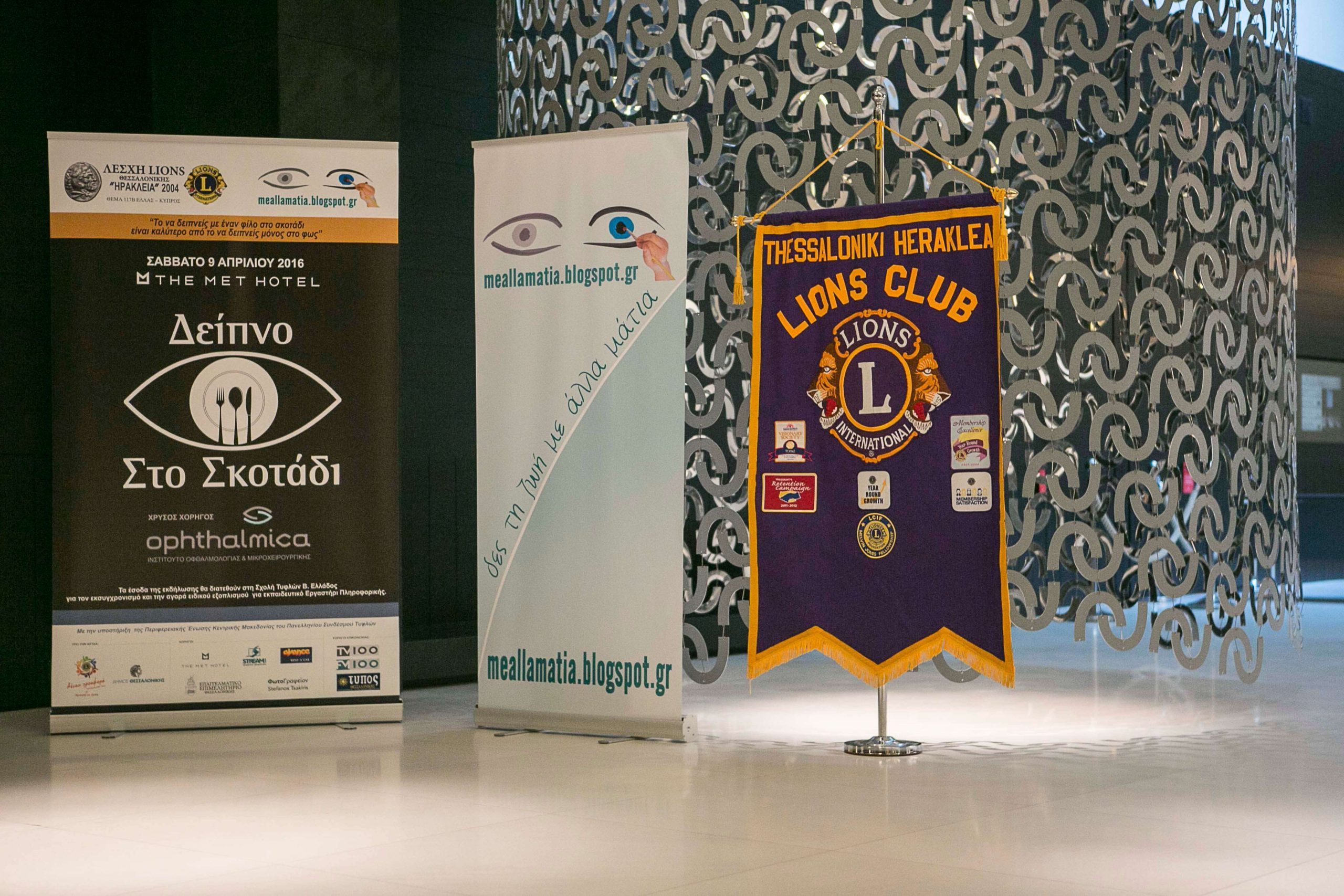 Το πρωτότυπο και βιωματικό «Δείπνο Στο Σκοτάδι» συνδιοργάνωσαν η Λέσχη Lions Θεσσαλονίκης «ΗΡΑΚΛΕΙΑ», υπό την αιγίδα του Θέματος 117 Ελλάς-Κύπρος των «Lions Clubs International» μαζί με το Κοινωνικοπολιτικό blog «Με Άλλα Μάτια» (http://meallamatia.blogspot.com) του δικηγόρου και Επικεφαλής της Νεολαίας του Πανελληνίου Συνδέσμου Τυφλών κ. Βαγγέλη Αυγουλά.